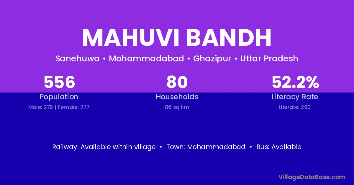 Mahuvi Bandh village has a total population of 556 people, of which 279 are males and 277 are females.