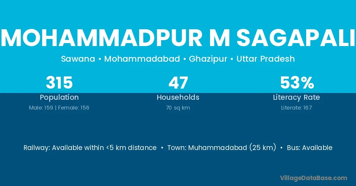 Muhammadabad (25 km) is the nearest town to Mohammadpur M Sagapali village for major economic activities and is located approximately 25 km away.
