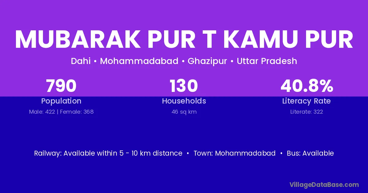 Mubarak Pur T Kamu Pur village has a total population of 790 people, of which 422 are males and 368 are females.