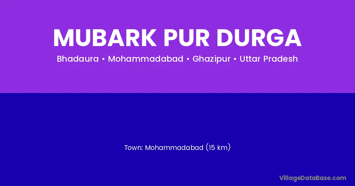 Mohammadabad (15 km) is the nearest town to Mubark Pur Durga village for major economic activities and is located approximately 15 km away.