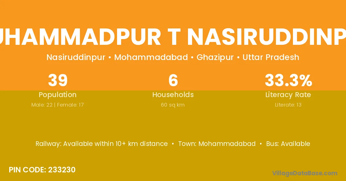 Muhammadpur T Nasiruddinpur village has a total population of 39 people, of which 22 are males and 17 are females.