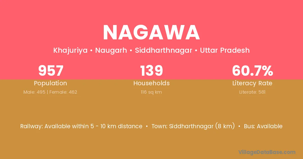 The literacy rate of Nagawa village is 57.52%. Male literacy stands at 68.58% and female literacy at 45.40%.