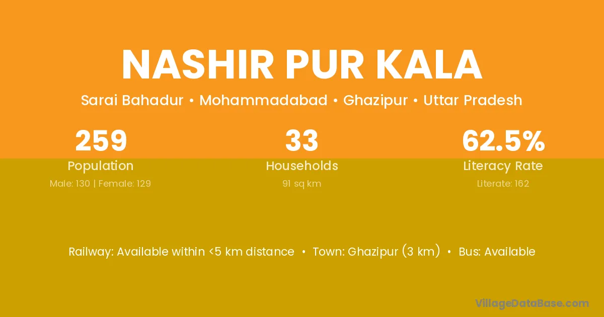 Nashir Pur Kala village has a total population of 259 people, of which 130 are males and 129 are females.