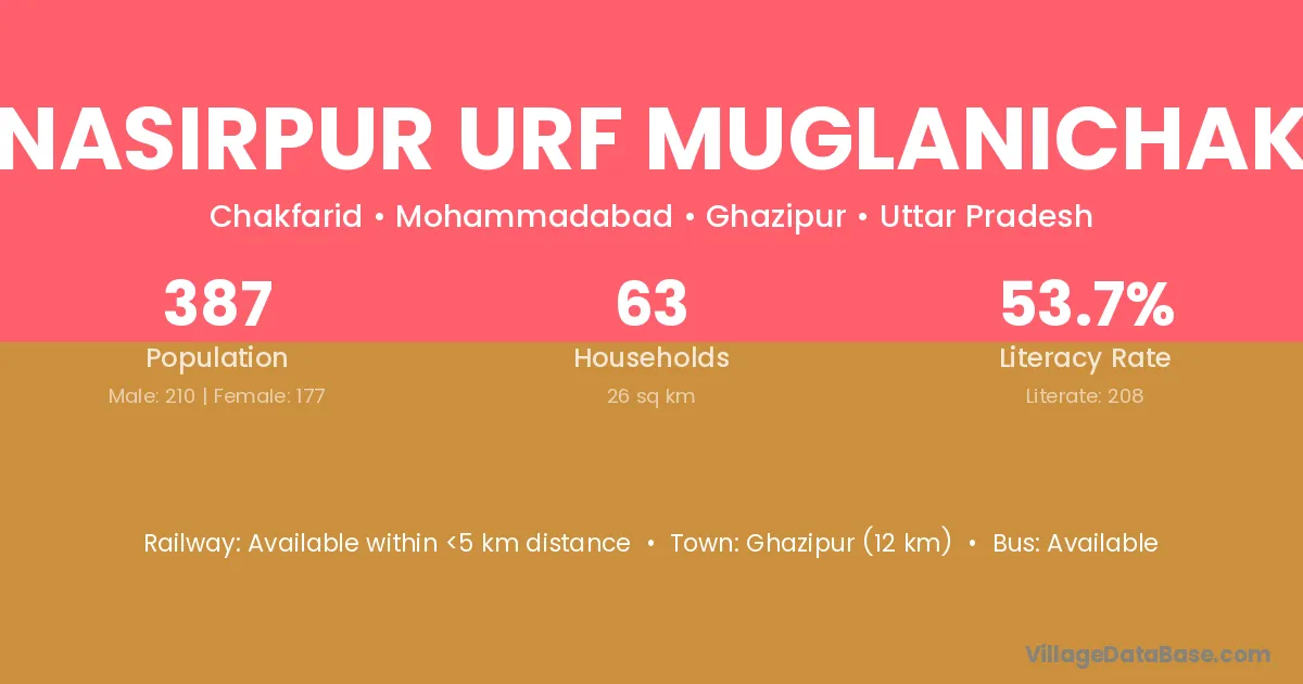 Nasirpur Urf Muglanichak village has a total population of 387 people, of which 210 are males and 177 are females.
