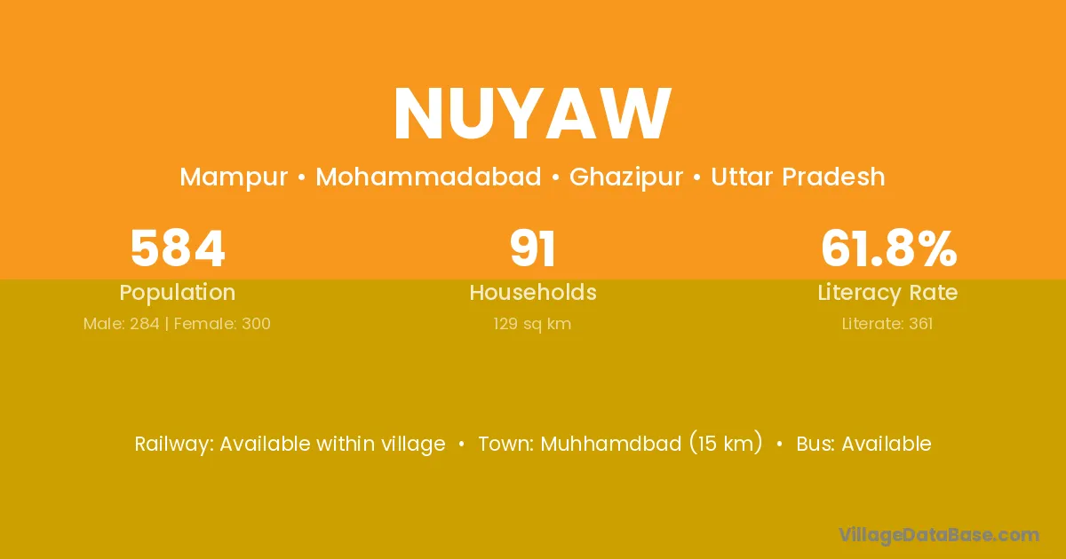 Muhhamdbad (15 km) is the nearest town to Nuyaw village for major economic activities and is located approximately 15 km away.