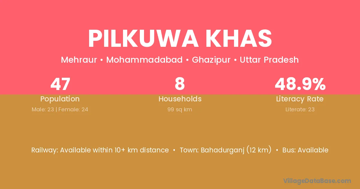 Pilkuwa Khas village has a total population of 47 people, of which 23 are males and 24 are females.
