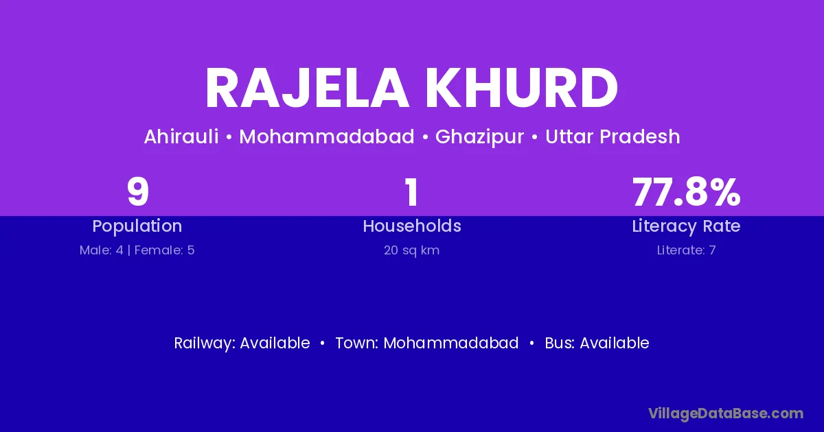 Rajela Khurd village has a total population of 9 people, of which 4 are males and 5 are females.