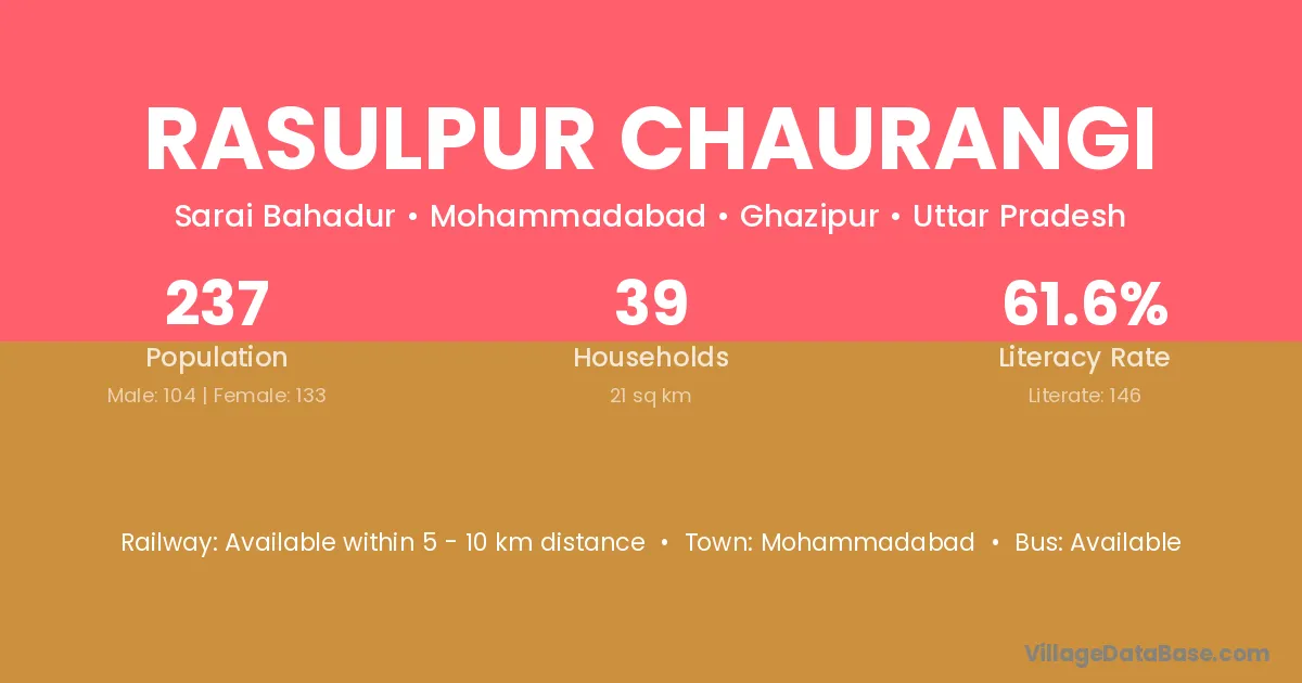 Rasulpur Chaurangi village has a total population of 237 people, of which 104 are males and 133 are females.