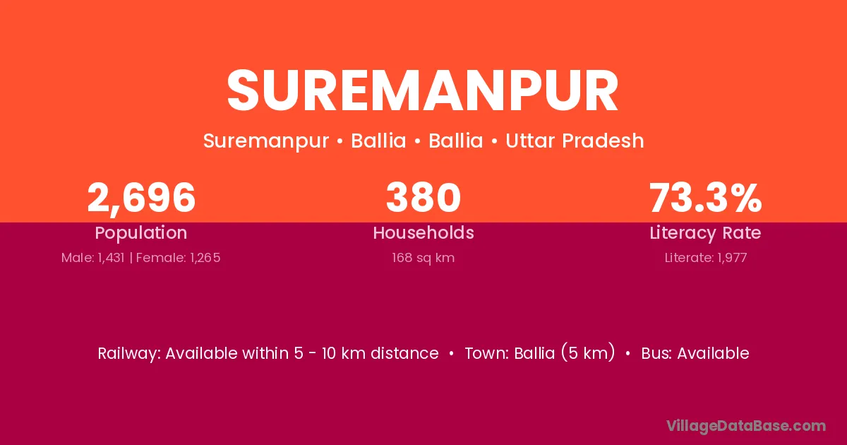 The literacy rate of Suremanpur village is 56.96%. Male literacy stands at 70.00% and female literacy at 43.59%.