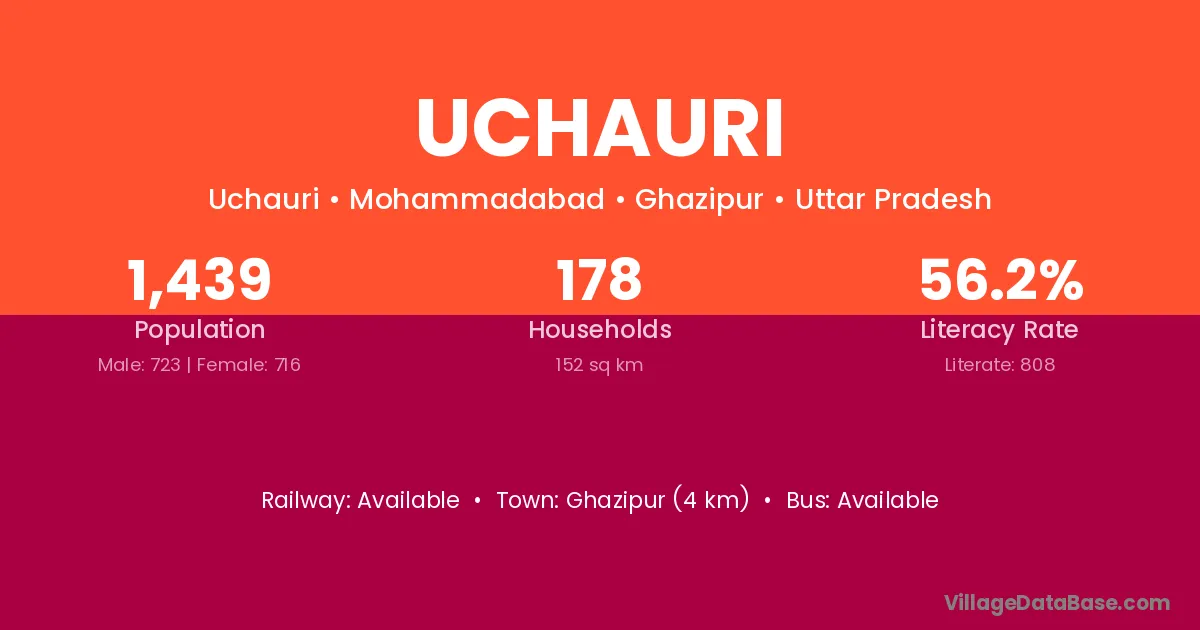 Ghazipur (4 km) is the nearest town to Uchauri village for major economic activities and is located approximately 4 km away.
