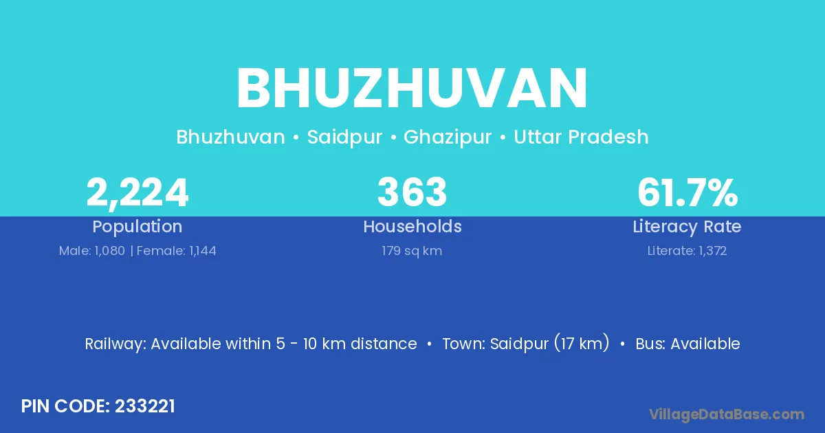 Saidpur (17 km) is the nearest town to Bhuzhuvan village for major economic activities and is located approximately 17 km away.