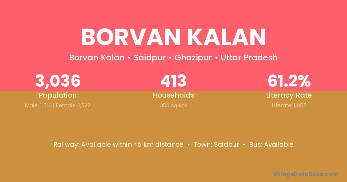 Borvan Kalan village has a total population of 3,036 people, of which 1,514 are males and 1,522 are females.
