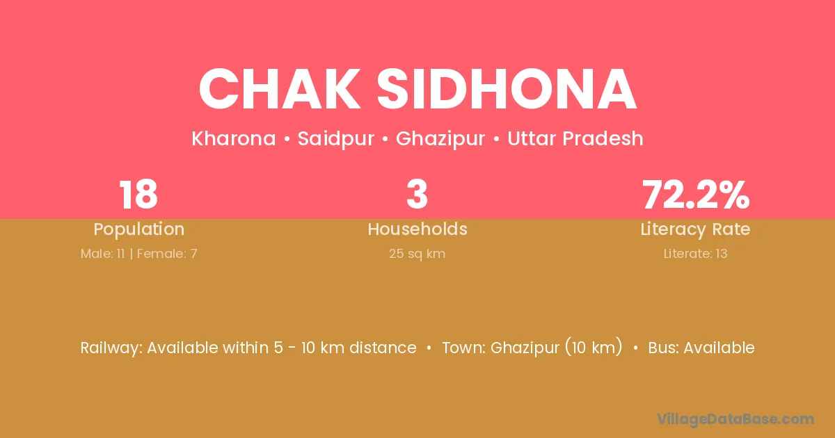 Ghazipur (10 km) is the nearest town to Chak Sidhona village for major economic activities and is located approximately 10 km away.
