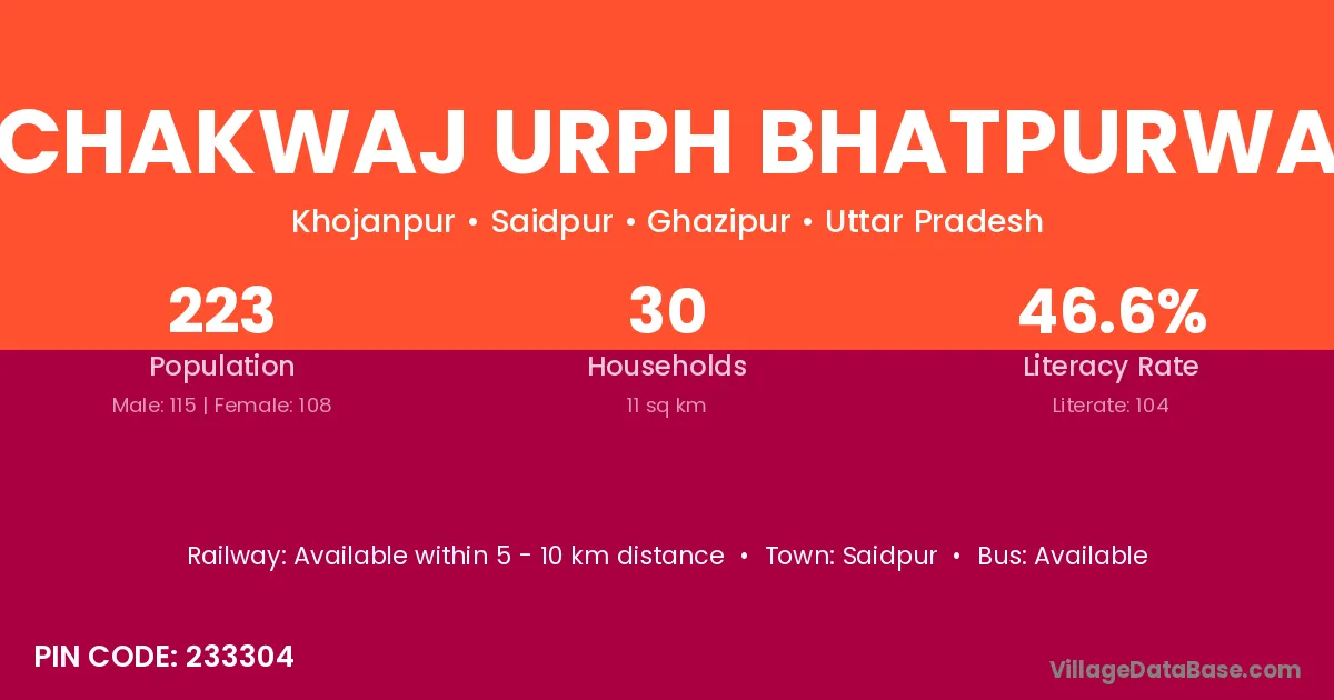Chakwaj Urph Bhatpurwa village has a total population of 223 people, of which 115 are males and 108 are females.