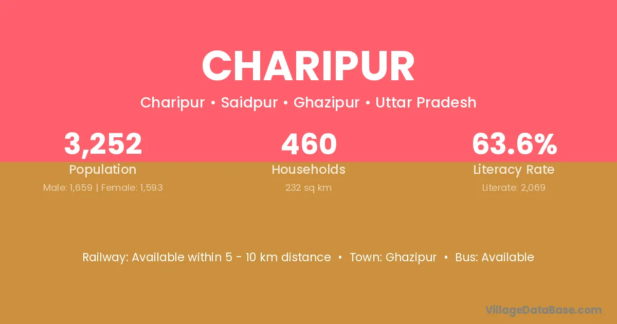 Charipur village has a total population of 3,252 people, of which 1,659 are males and 1,593 are females.