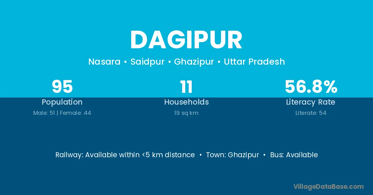 Dagipur village has a total population of 95 people, of which 51 are males and 44 are females.