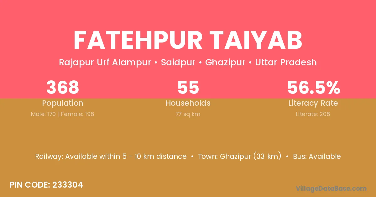Ghazipur (33 km) is the nearest town to Fatehpur Taiyab village for major economic activities and is located approximately 33 km away.