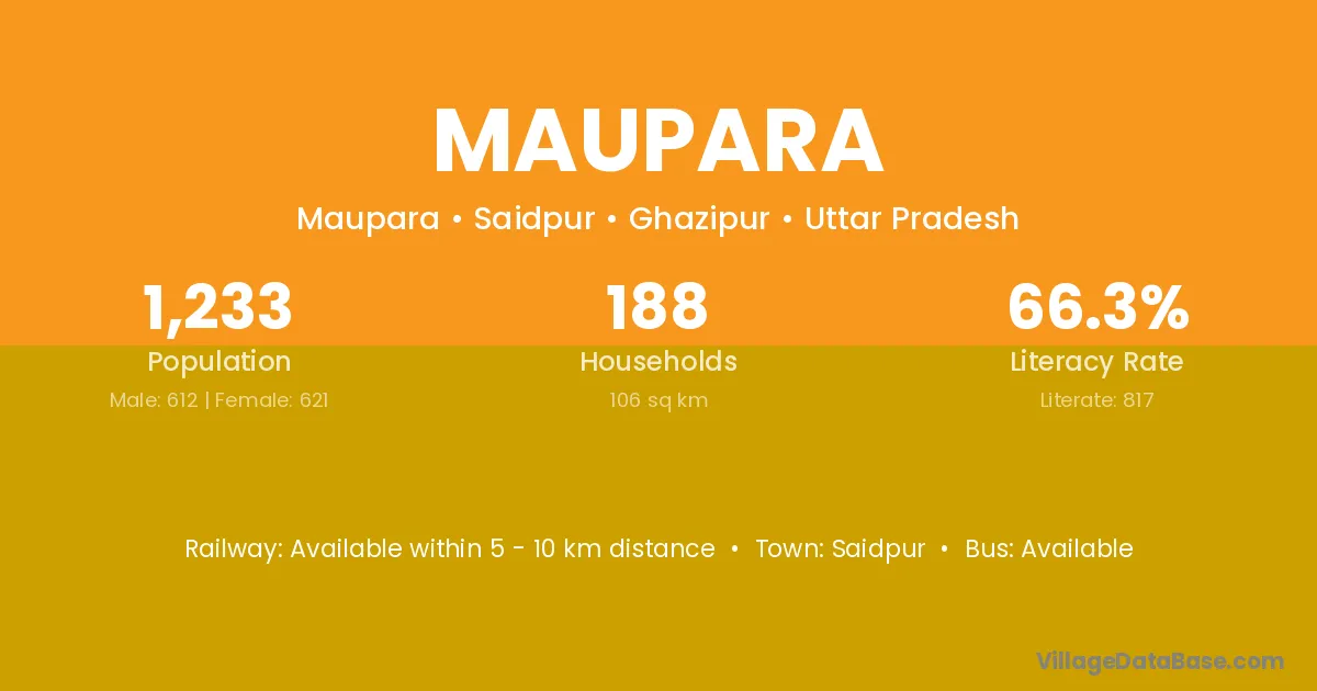 Maupara village has a total population of 1,233 people, of which 612 are males and 621 are females.
