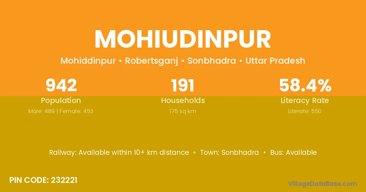 The literacy rate of Mohiudinpur village is 63.82%. Male literacy stands at 69.01% and female literacy at 58.82%.