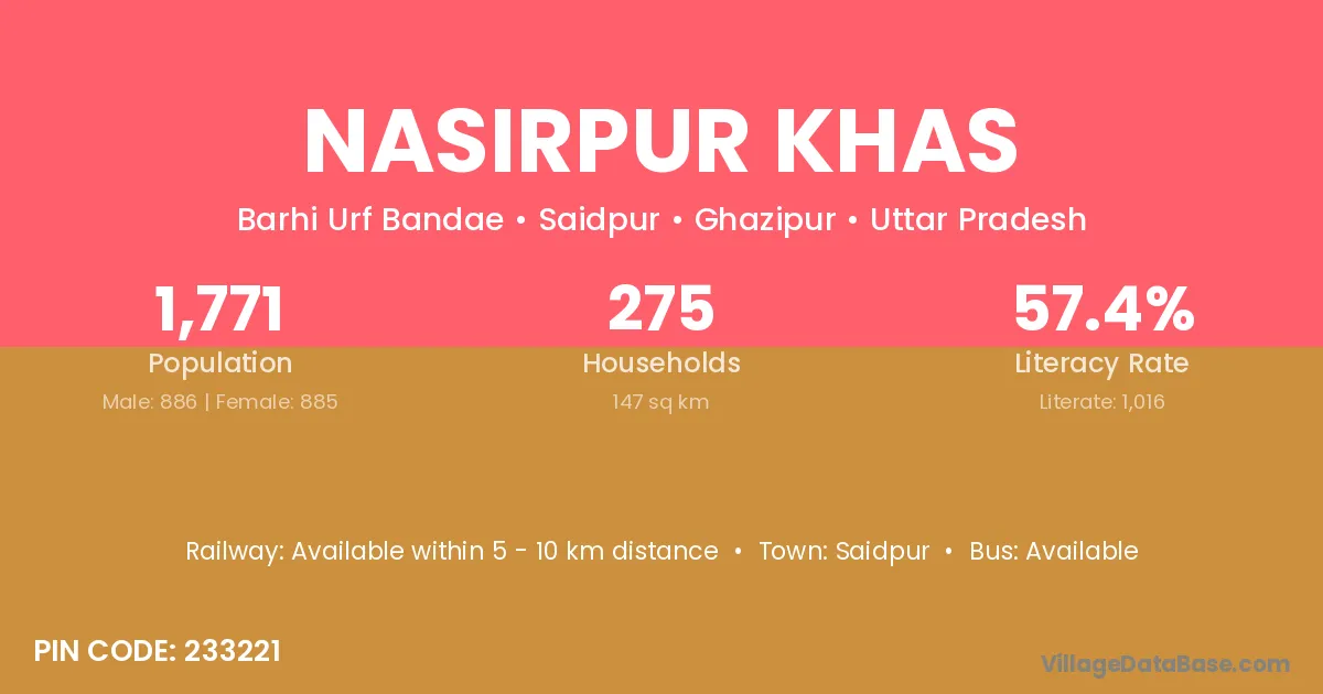 Nasirpur Khas village has a total population of 1,771 people, of which 886 are males and 885 are females.