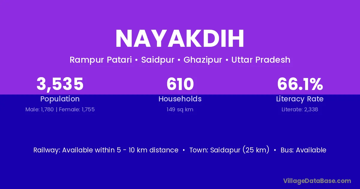 Saidapur (25 km) is the nearest town to Nayakdih village for major economic activities and is located approximately 25 km away.