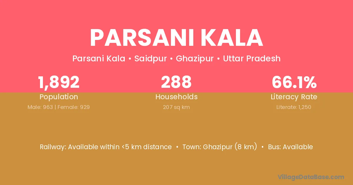 Ghazipur (8 km) is the nearest town to Parsani Kala village for major economic activities and is located approximately 8 km away.