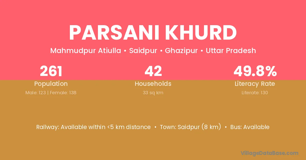 Saidpur (8 km) is the nearest town to Parsani Khurd village for major economic activities and is located approximately 8 km away.