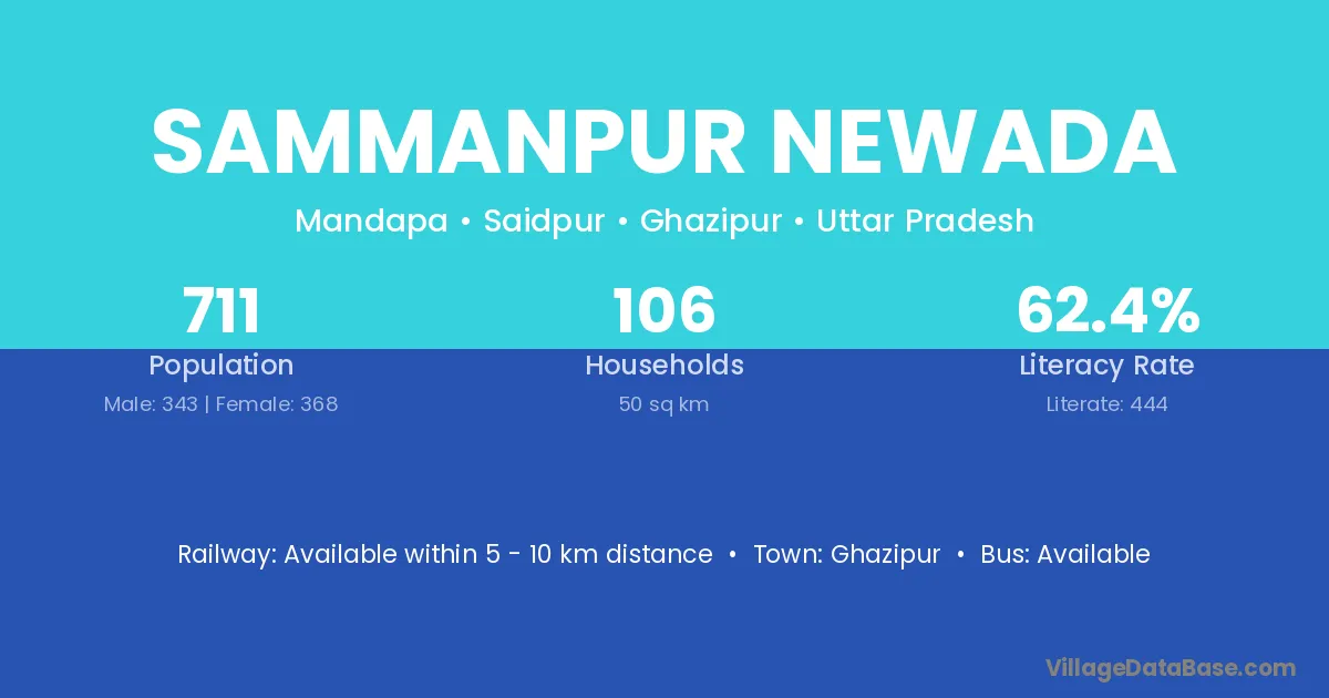 Sammanpur Newada village has a total population of 711 people, of which 343 are males and 368 are females.