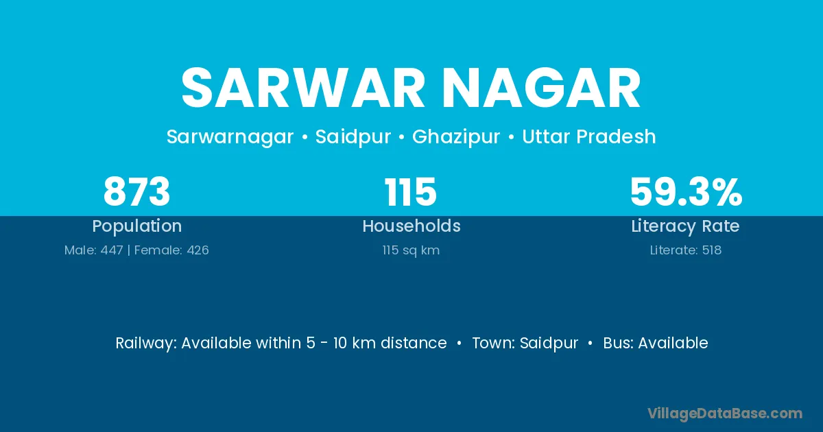 Sarwar Nagar village has a total population of 873 people, of which 447 are males and 426 are females.