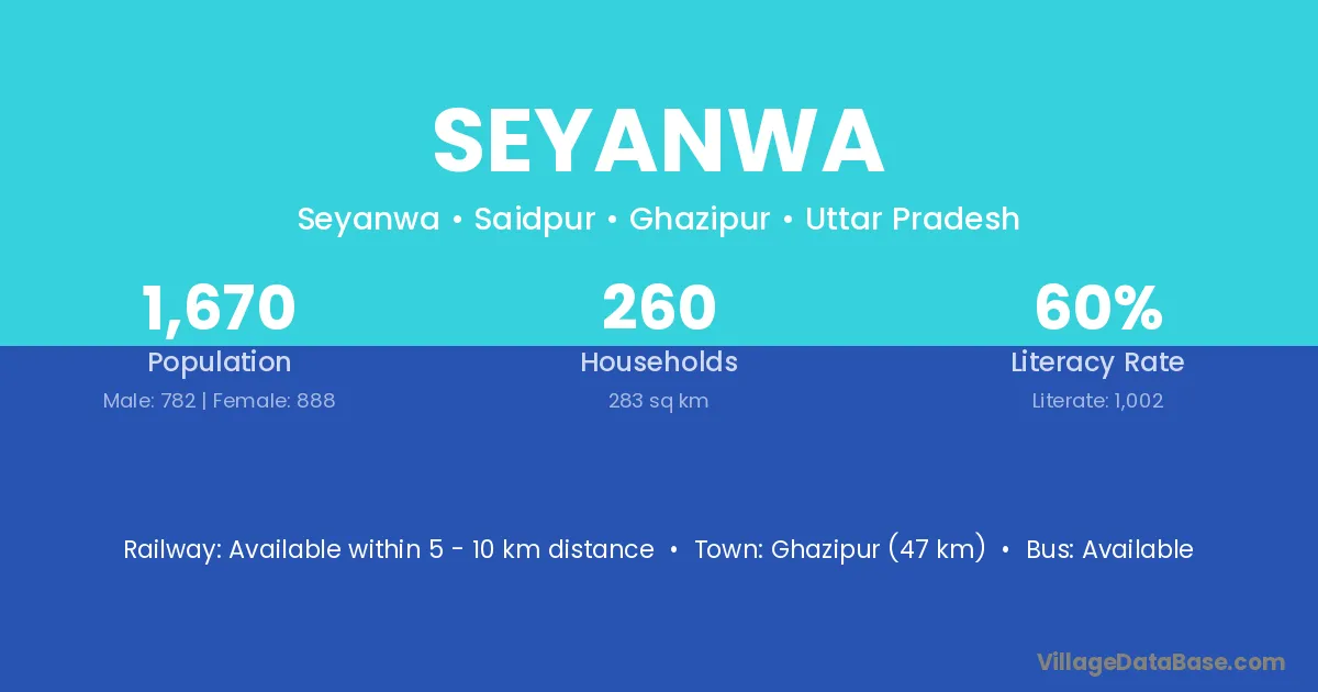Ghazipur (47 km) is the nearest town to Seyanwa village for major economic activities and is located approximately 47 km away.