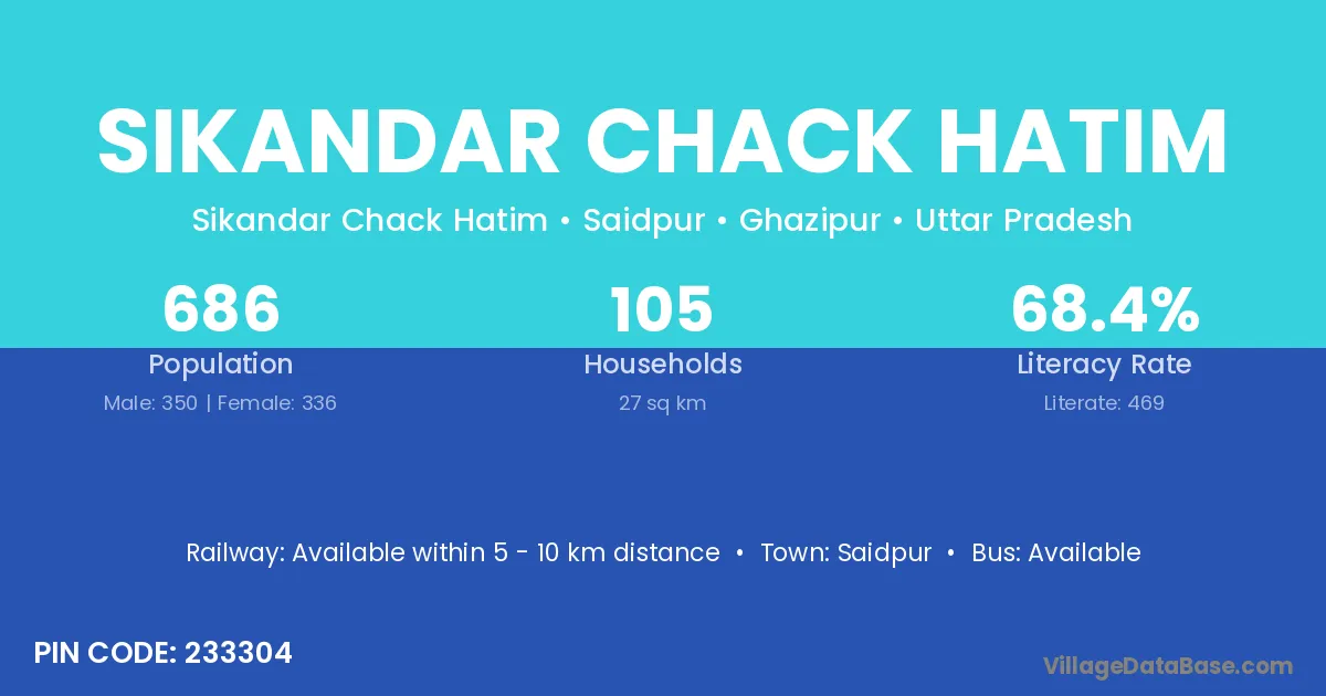 Sikandar Chack Hatim village has a total population of 686 people, of which 350 are males and 336 are females.