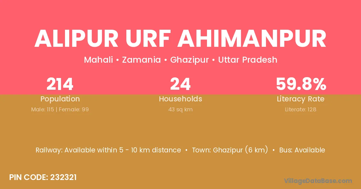 Alipur Urf Ahimanpur village has a total population of 214 people, of which 115 are males and 99 are females.