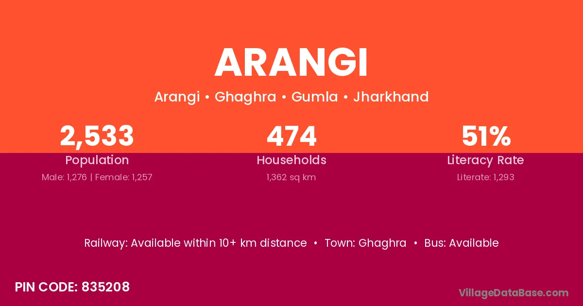 Arangi village has a total population of 3,006 people, of which 1,565 are males and 1,441 are females.