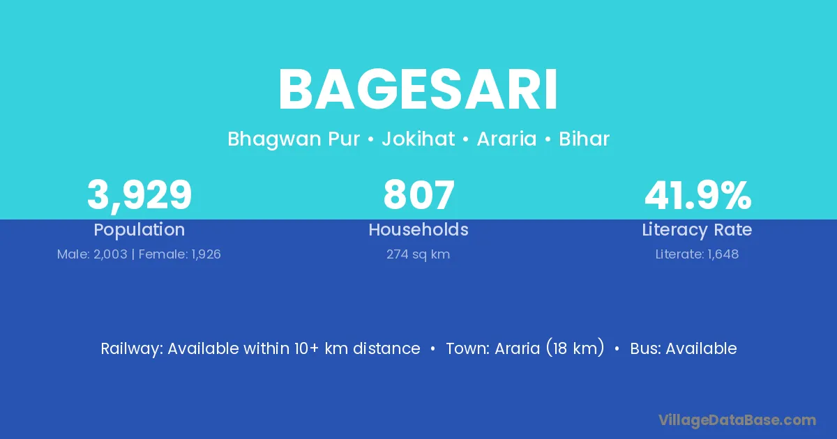 The literacy rate of Bagesari village is 45.48%. Male literacy stands at 55.50% and female literacy at 34.39%.