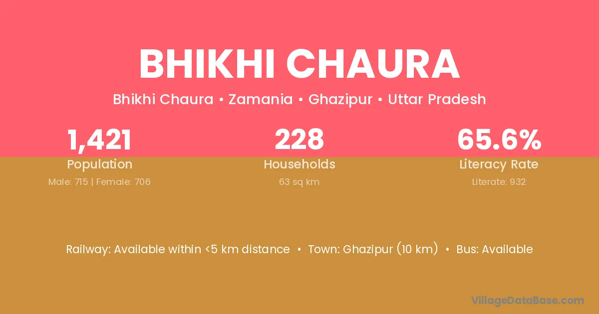 Ghazipur (10 km) is the nearest town to Bhikhi Chaura village for major economic activities and is located approximately 10 km away.