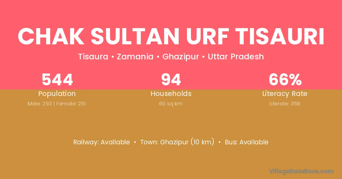 Ghazipur (10 km) is the nearest town to Chak Sultan Urf Tisauri village for major economic activities and is located approximately 10 km away.