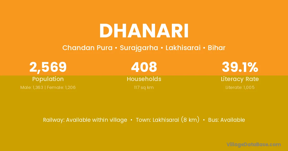 Dhanari village has a total population of 2,280 people, of which 1,141 are males and 1,139 are females.