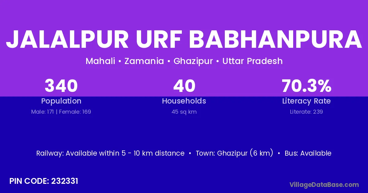 Ghazipur (6 km) is the nearest town to Jalalpur Urf Babhanpura village for major economic activities and is located approximately 6 km away.