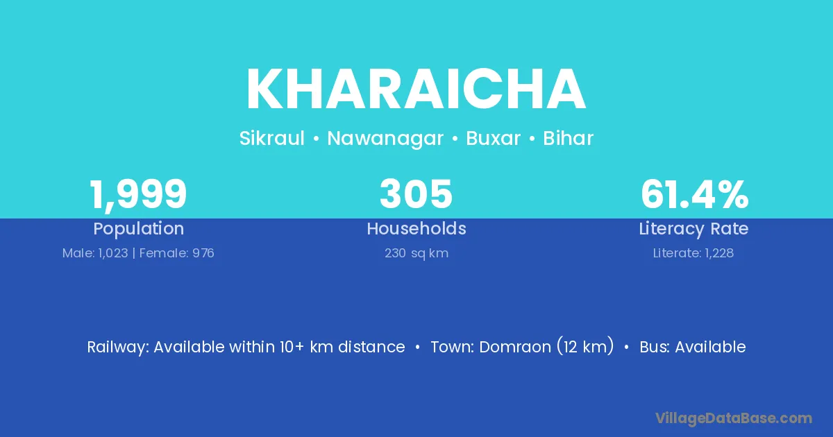 The literacy rate of Kharaicha village is 60.25%. Male literacy stands at 70.68% and female literacy at 49.85%.