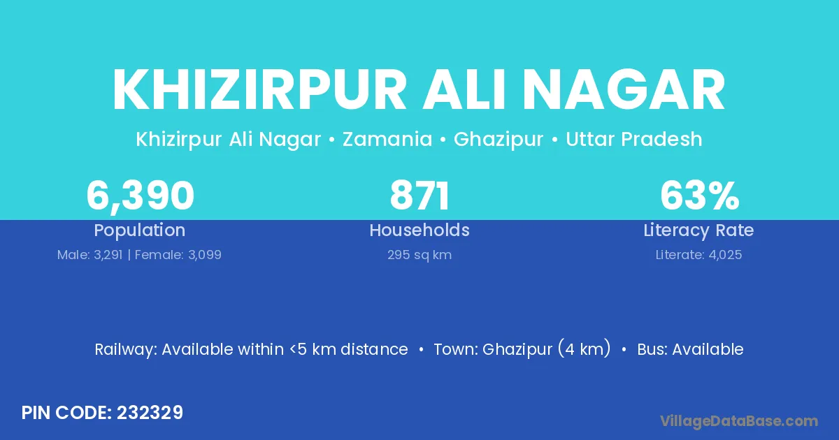 Ghazipur (4 km) is the nearest town to Khizirpur Ali Nagar village for major economic activities and is located approximately 4 km away.