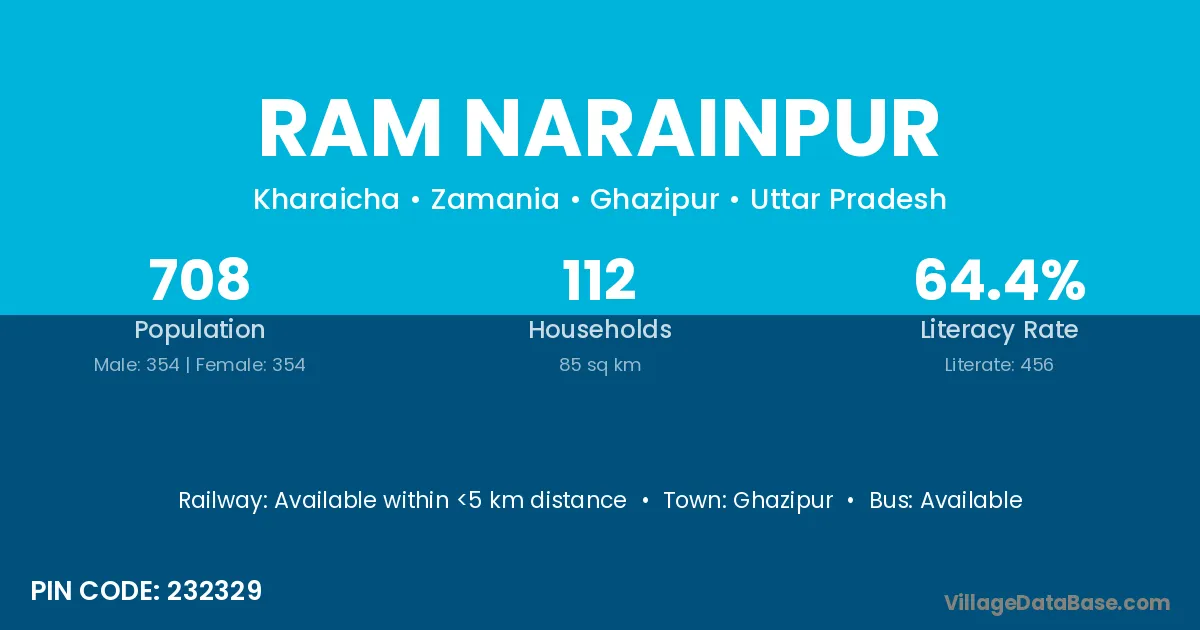 Ram Narainpur village has a total population of 708 people, of which 354 are males and 354 are females.