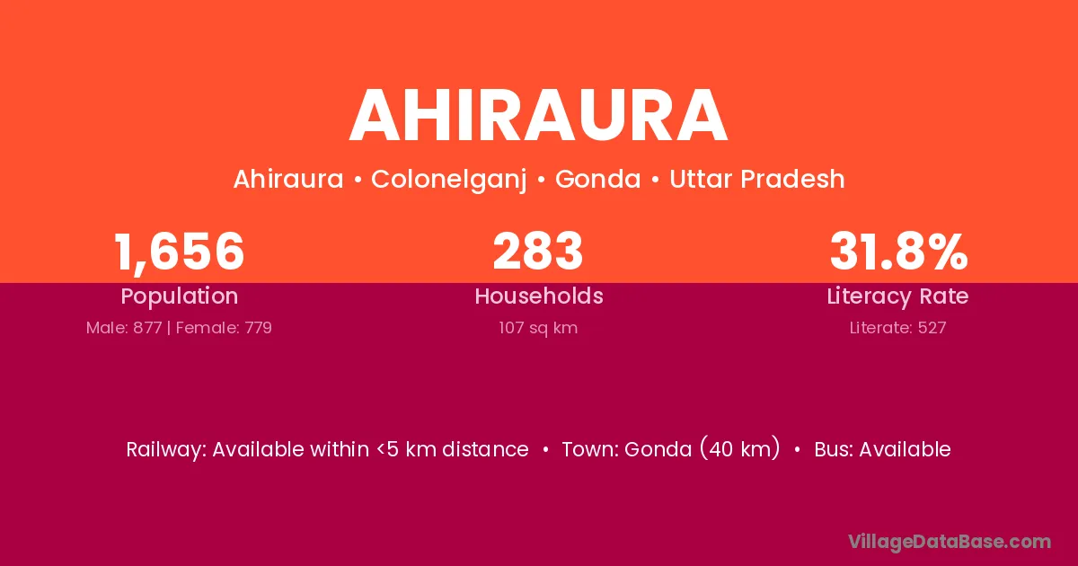 Gonda (40 km) is the nearest town to Ahiraura village for major economic activities and is located approximately 40 km away.