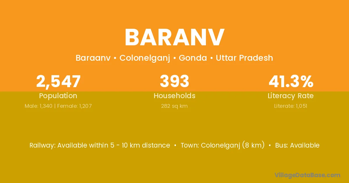 Colonelganj (8 km) is the nearest town to Baranv village for major economic activities and is located approximately 8 km away.