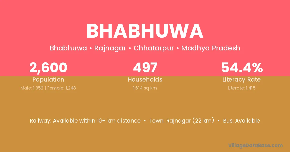 Bhabhuwa village has a total population of 1,851 people, of which 982 are males and 869 are females.