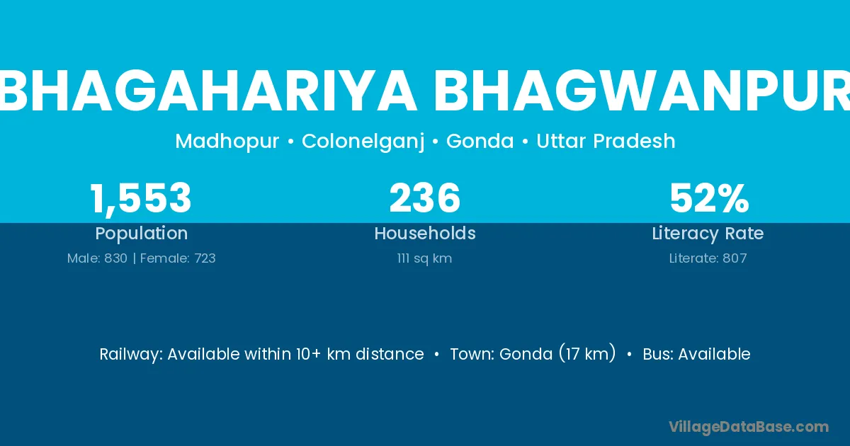 Gonda (17 km) is the nearest town to Bhagahariya Bhagwanpur village for major economic activities and is located approximately 17 km away.