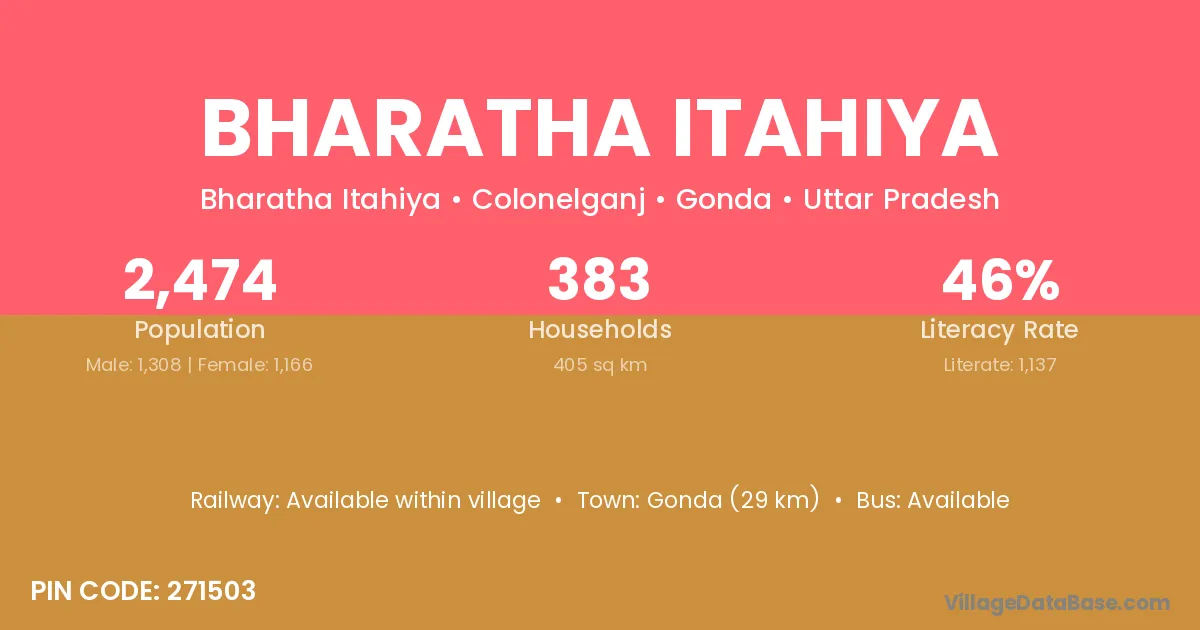 Gonda (29 km) is the nearest town to Bharatha Itahiya village for major economic activities and is located approximately 29 km away.