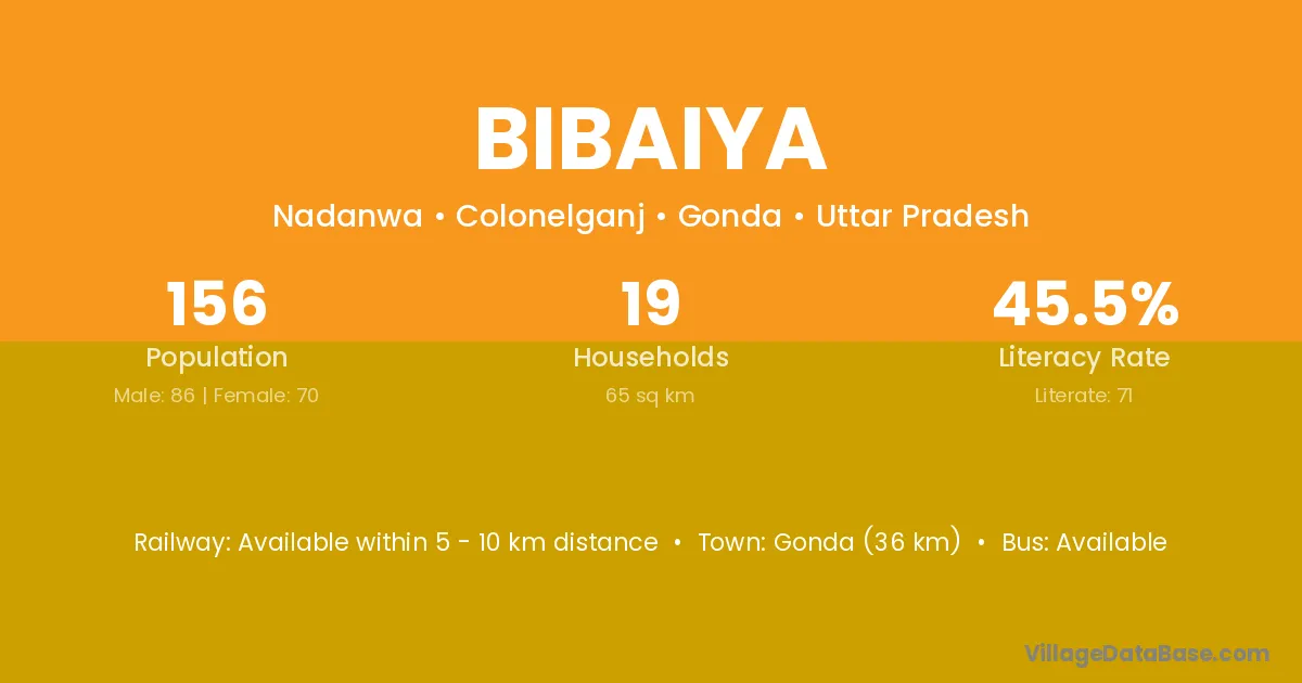 Gonda (36 km) is the nearest town to Bibaiya village for major economic activities and is located approximately 36 km away.