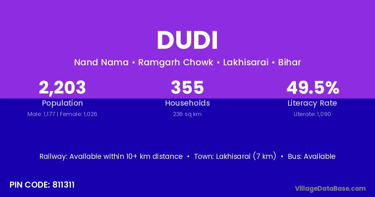 Kanailganj (12 km) is the nearest town to Dudi village for major economic activities and is located approximately 12 km away.