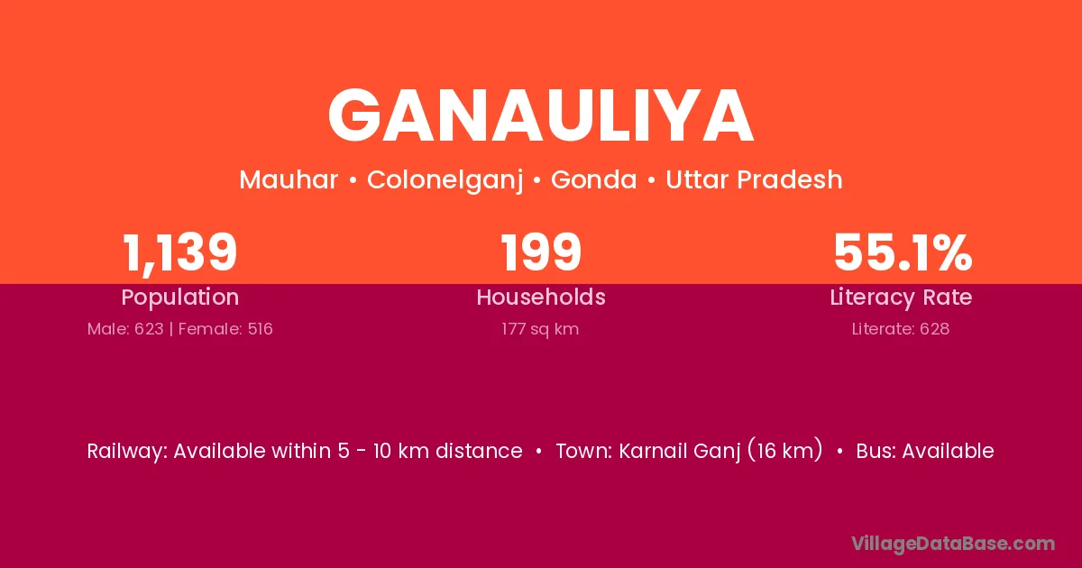 Ganauliya village has a total population of 1,139 people, of which 623 are males and 516 are females.