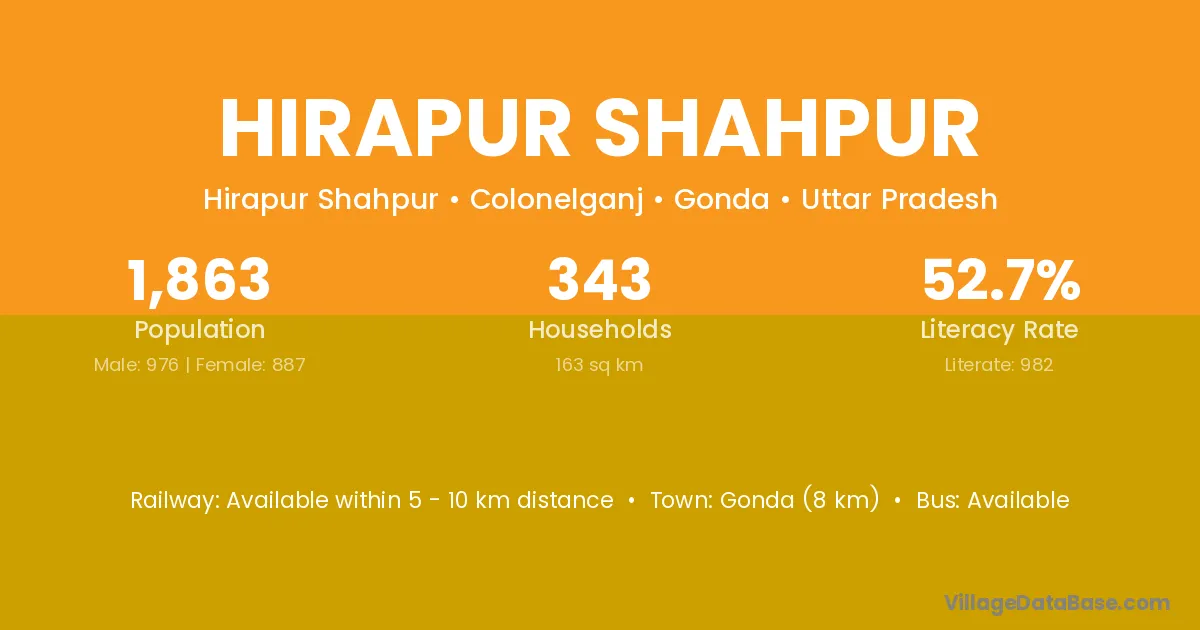 Gonda (8 km) is the nearest town to Hirapur Shahpur village for major economic activities and is located approximately 8 km away.